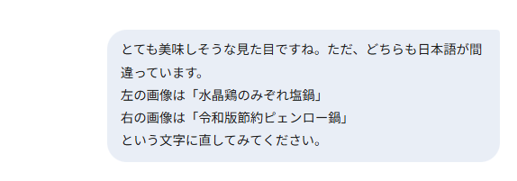 美味しそう!だけど、日本語がちょっと変。余談ですが、Nano Banana Proになって日本語を含めたマルチバイトの理解と表現が格段には上がったもののまだまだこういうエラーがありますね。せっかくなので正しく直せるか、試してみました。